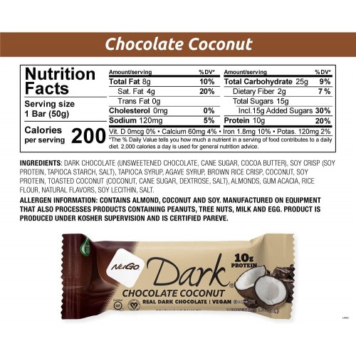 When you bite into a crunchy & delicious NuGo Dark Chocolate Coconut bar, you might think you're eating a chocolate bar. Yes, NuGO Dark is the coated protein & nutrition vegan bar made delicious by real dark chocolate (no palm oil). This luscious antioxidant-rich cacao dark chocolate helps to neutralize free radicals and protect your body from cell damage. Gluten-free.