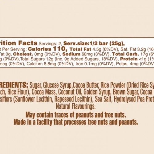Ingredients: Sugar, Glucose Syrup,Cocoa Butter, Rice Powder (Dried Rice Syrup, Rice Starch, Rice Flour), Cocoa Mass, Coconut Oil, Golden Syrup, Brown Sugar, Cocoa Powder, Emulsifiers (Suntlower Lecithin, Rapeseed Lecithin), Sea Salt, Hydrolysed Pea Protein,Natural Flavors..